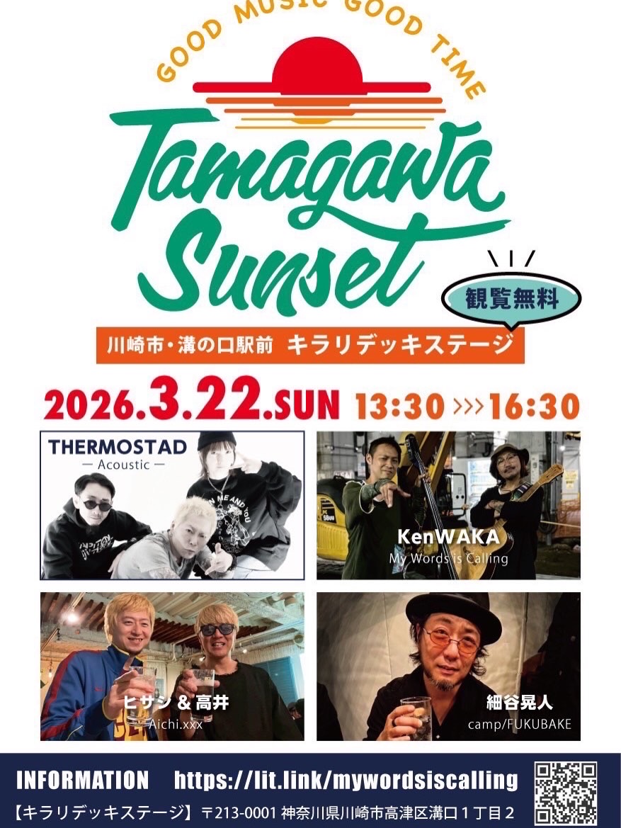 2026年3月22日 溝の口駅前 キラリデッキステージ(弾き語り) Email: thermostad@gmail.com “Tamagawa Sunset” 【日時】 2026.3.22.SUN 13:30〜16:30 観覧無料🆓 【場所】 川崎市・溝の口駅前 キラリデッキステージ 〒213-0001 神奈川県川崎市高津区溝口1丁目2 【出演者】 ・KenWAKA(My Words is Calling) ・THERMOSTAD-Acoustic- ・ヒサシ&高井(Aichi.xxx) ・細谷晃人(Camp/FUKUBAKE) 0 Facebook Twitter